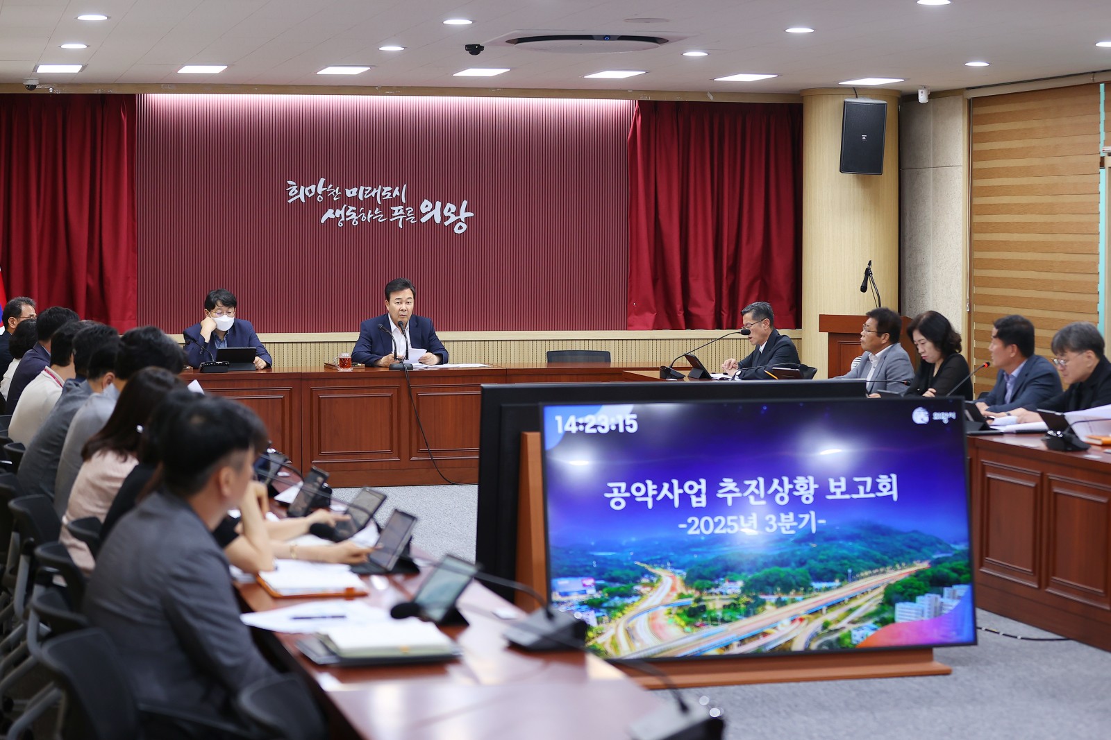<7월7일(월) 오후2시, 김성제 의왕시장은 중회의실에서 진행된 2025년 3분기 민선8기 공약사업 추진상황 보고회에서 참석해 회의를 진행했다.>